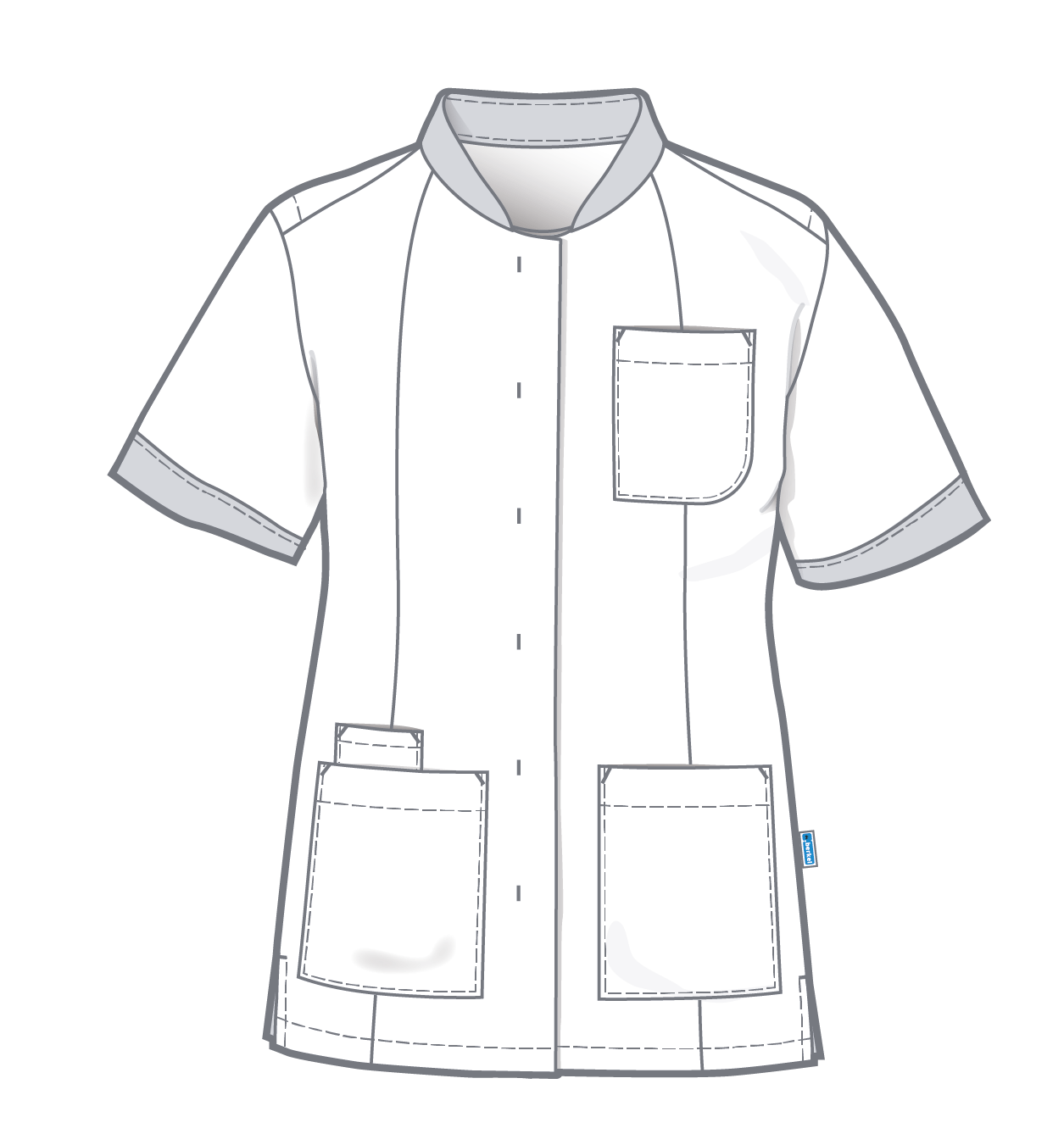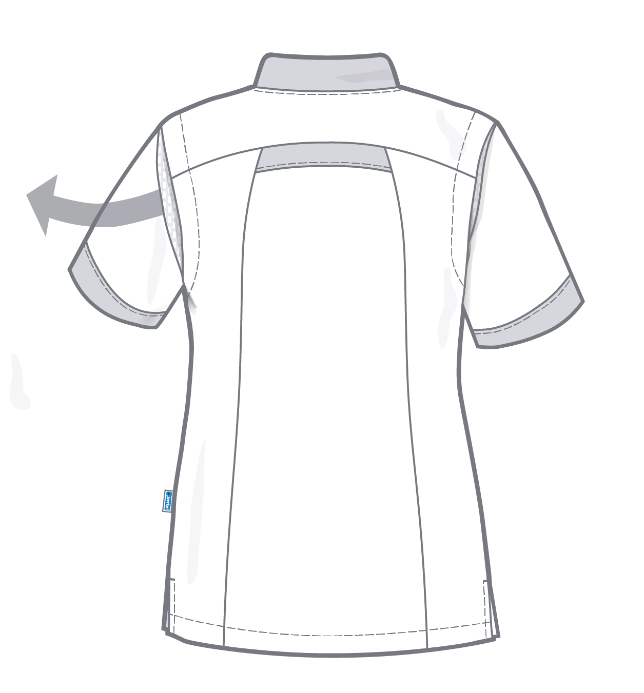 Fleur heeft een opstaande boord; verdekte drukknoopsluiting; korte mouwen met stretch inzetstukken voor meer bewegingsvrijheid; 1 borstzak; 2 zijzakken binnen met sleutel-lus, rechts met telefoonzak; zijsplitten.